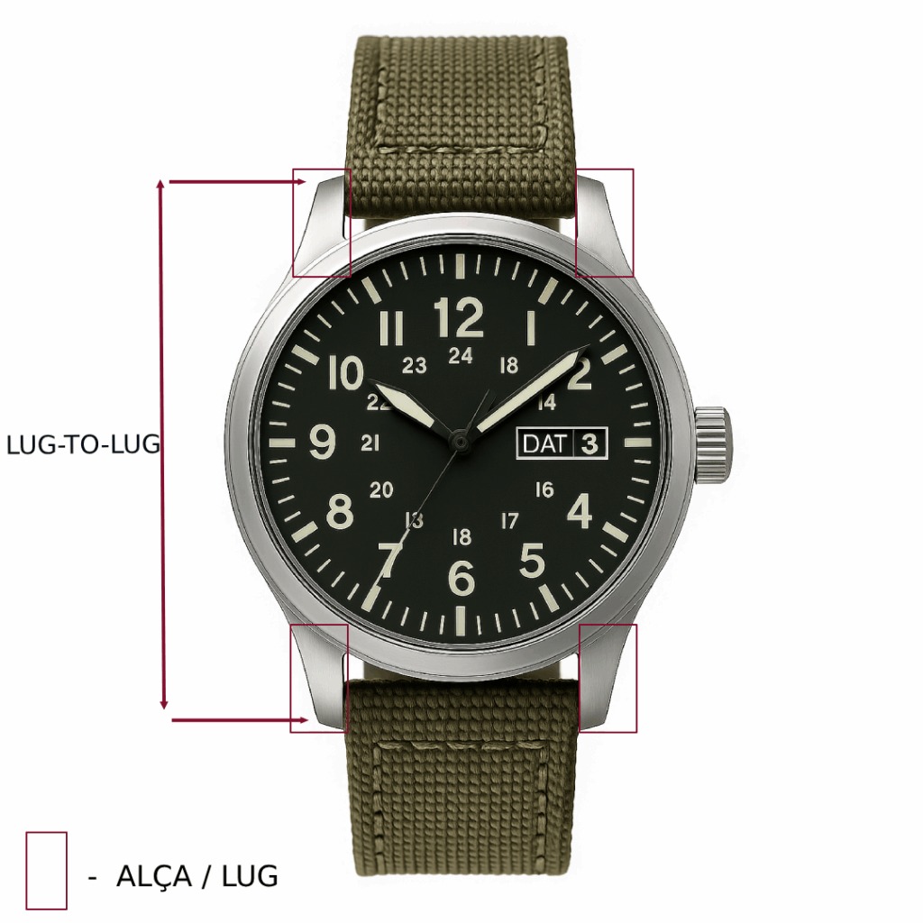 Conhecido também como alça. É a parte da caixa do relógio onde a pulseira é presa. É comum que as marcas informem a medida lug-to-lug (distância entre os lugs) nas especificações de seus modelos. (vide imagem)